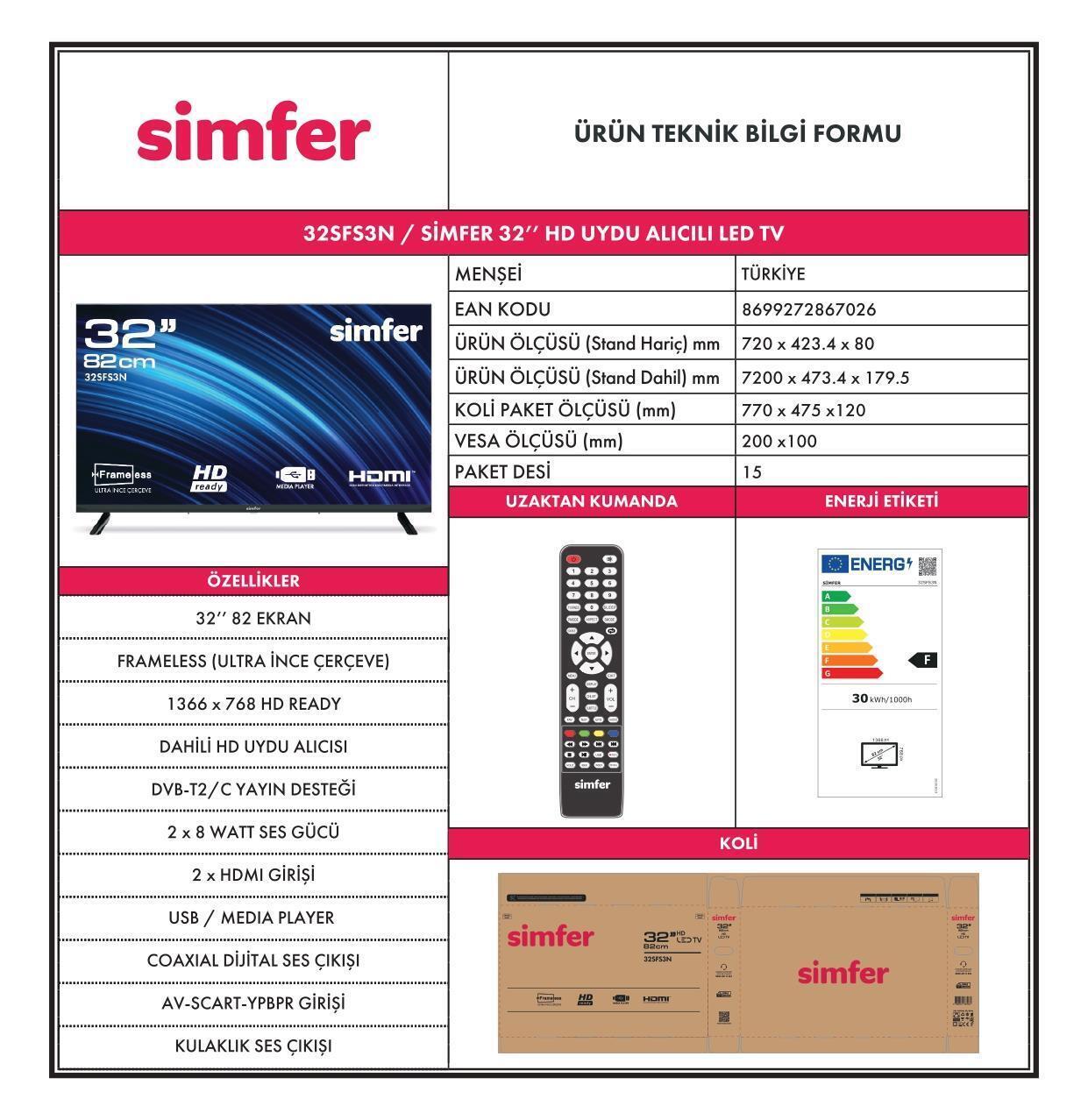 Simfer 32SFS3N 82 Ekran 32" Uydu Alıcılı Led HD Televizyon