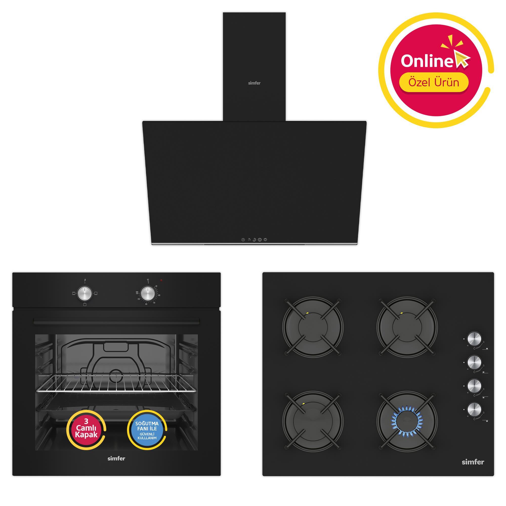 Simfer 4 Fonksiyon Trend Siyah Cam 3'lü Ankastre Set (Fırın + Ocak + Davlumbaz)