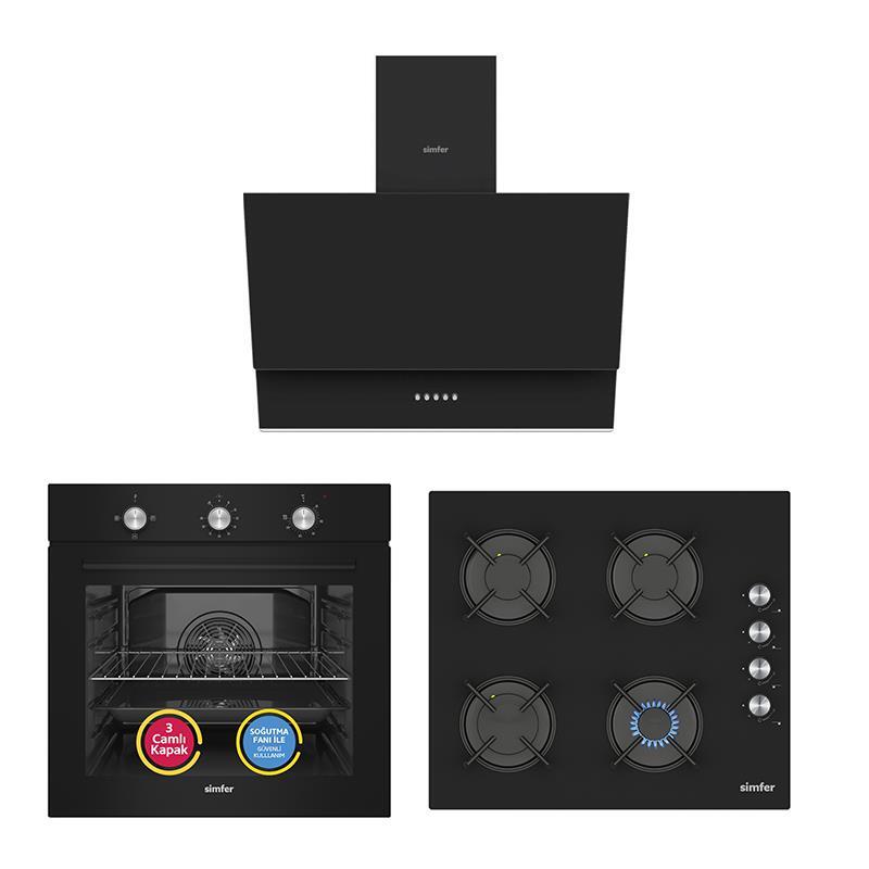 Simfer 4 Fonksiyon Trend Mekanik Siyah Cam 3'lü Ankastre Set (Fırın + Ocak + Davlumbaz)
