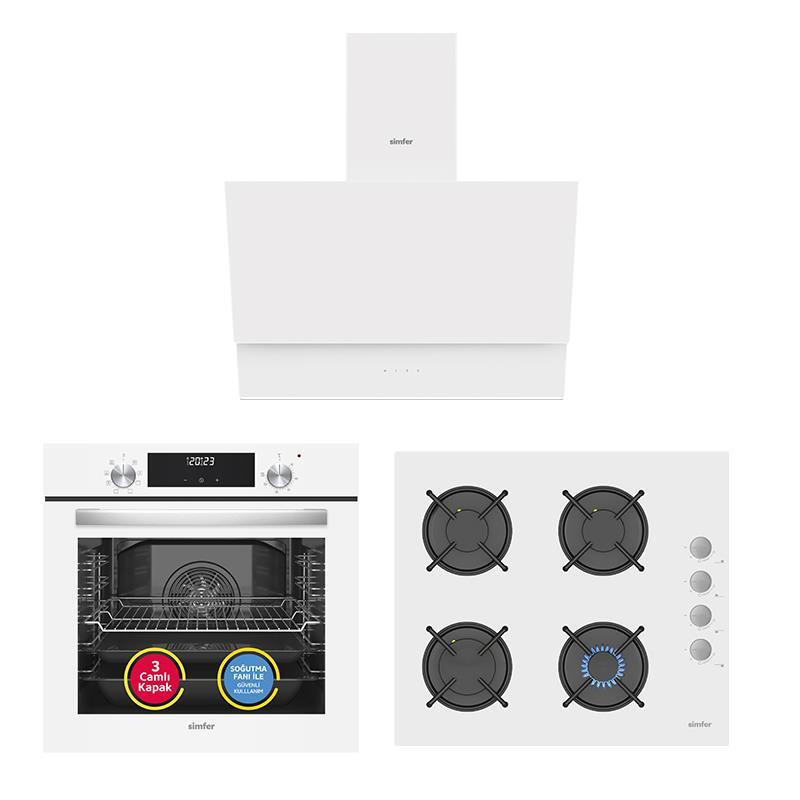 Simfer 4 Fonksiyon Trend Beyaz Cam 3'lü Ankastre Set ( Fırın - Ocak - Davlumbaz)