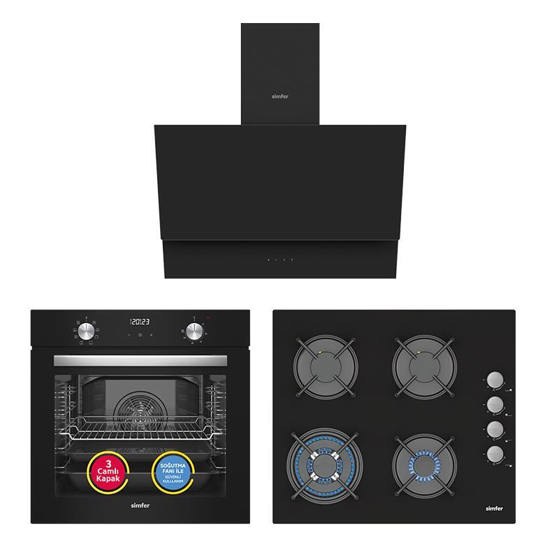 Simfer 8 Fonksiyon Siyah Multi Turbo Dijital 3'lü Ankastre Set (Fırın + Ocak + Davlumbaz)