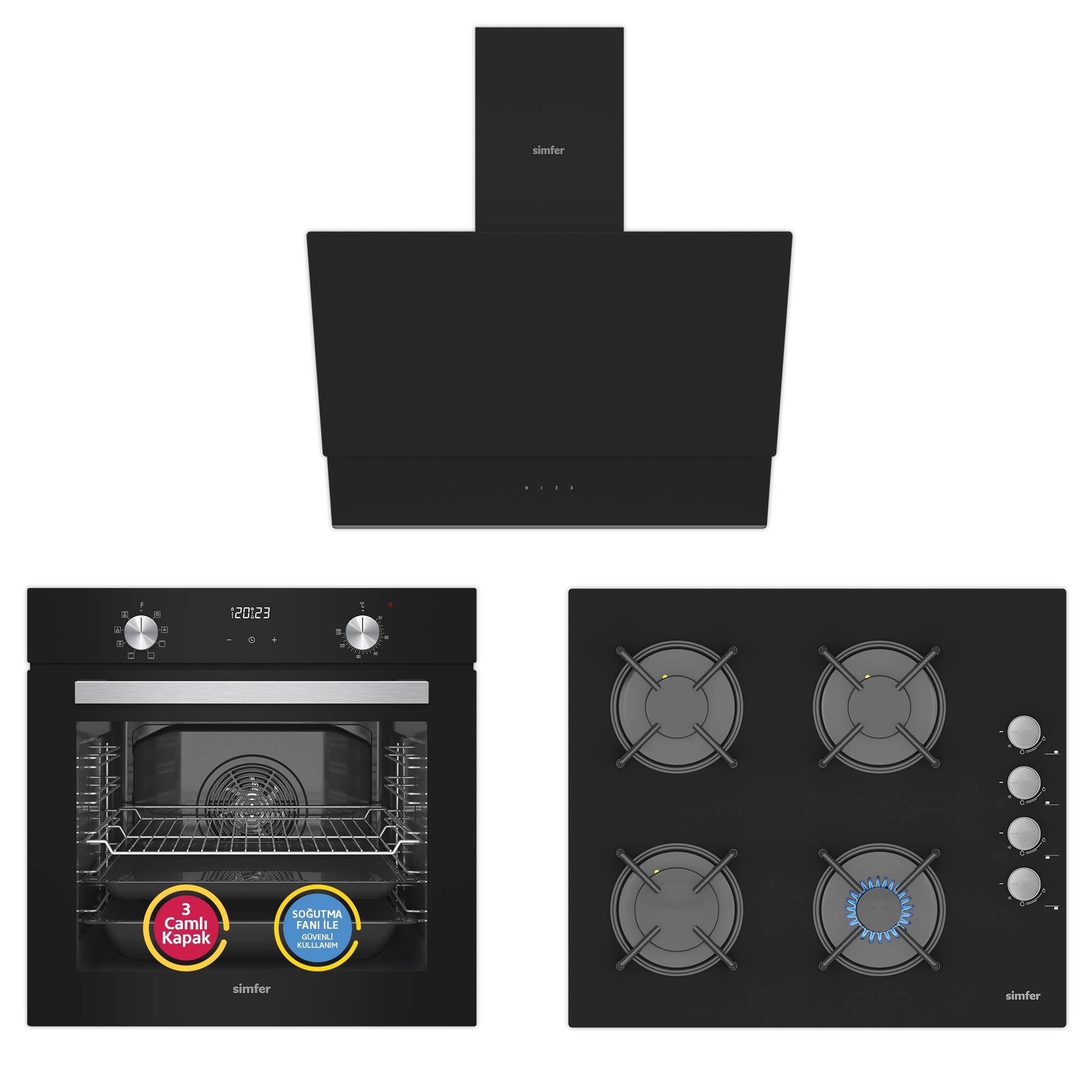 Simfer 4 Fonksiyon Trend Mekanik Siyah Cam 3'lü Ankastre Set (Fırın + Ocak + Davlumbaz)