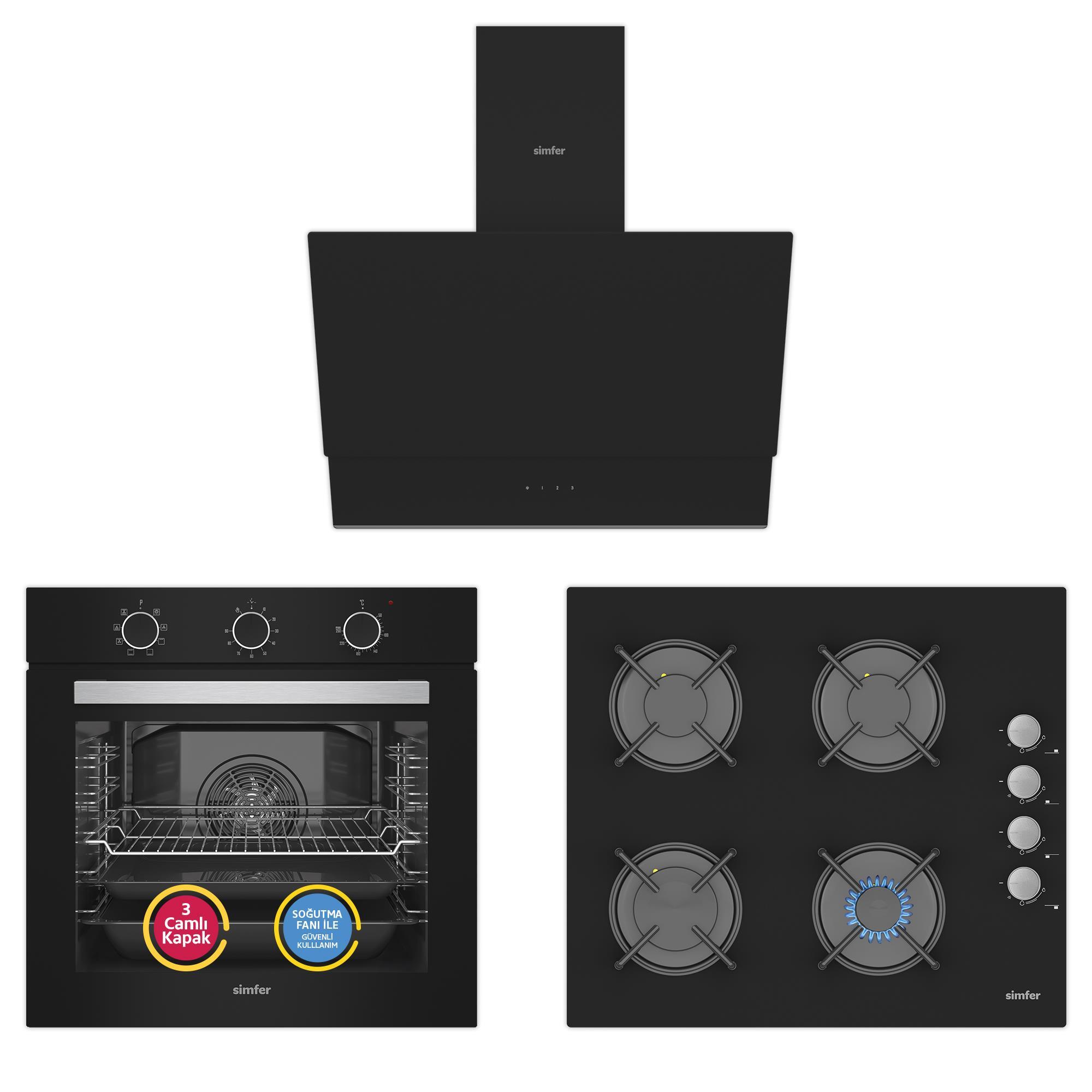 Simfer 9 Fonksiyon QS Mekanik Siyah Büyük Pop-Up 3'lü Ankastre Set (8220 Fırın + 3500 Ocak + 8703 Davlumbaz)